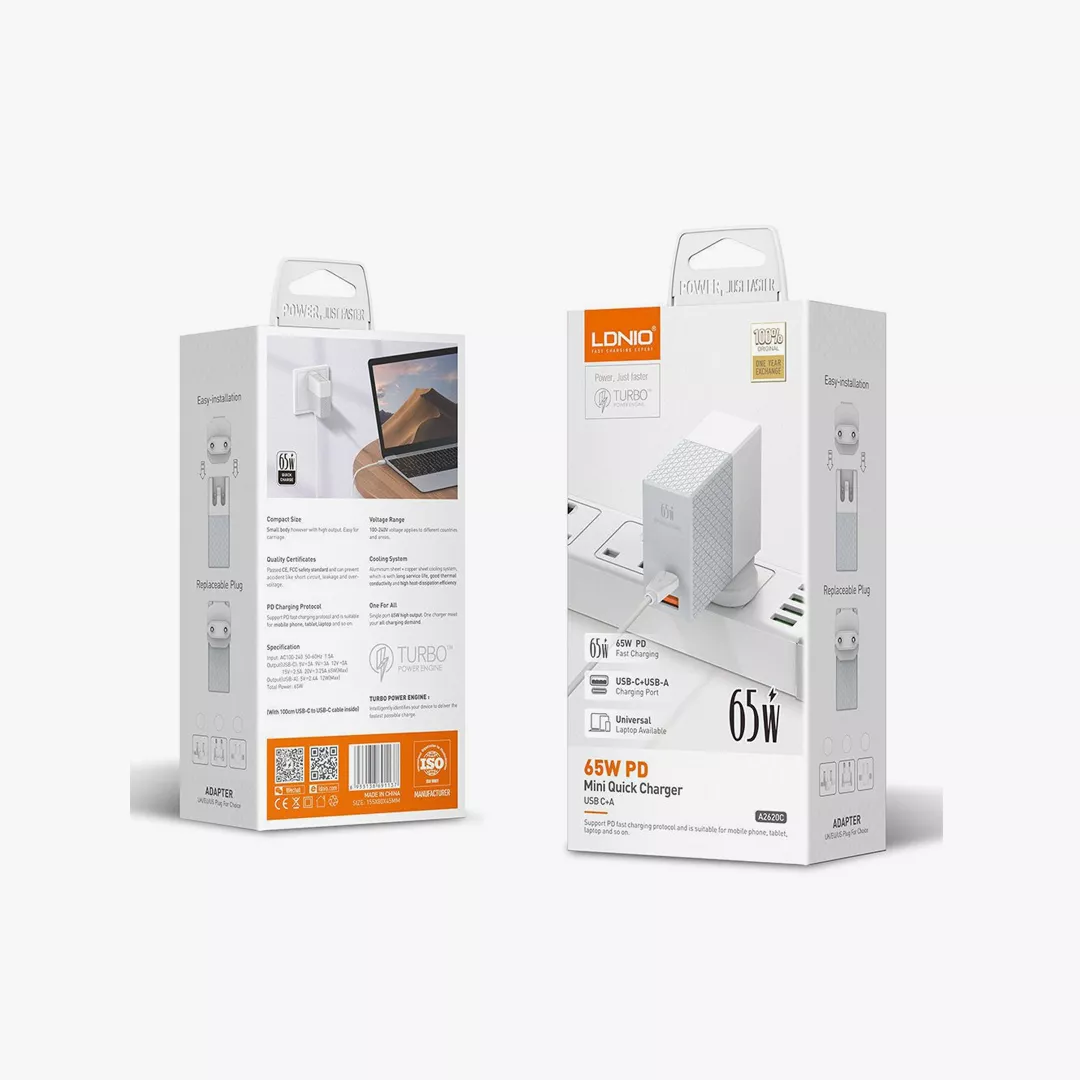 هل تعاني من كثرة الشواحن وبطء سرعة الشحن لأجهزتك المتعددة؟ شاحن LDNIO A2620C هو الحل النهائي الذي يغنيك عن حمل شواحن إضافية. بفضل قوته الجبارة التي تصل إلى 65 واط، يمكنك الآن شحن هاتفك الذكي، جهازك اللوحي، وحتى حاسوبك المحمول (Laptop) بسرعة فائقة وفي وقت قياسي.